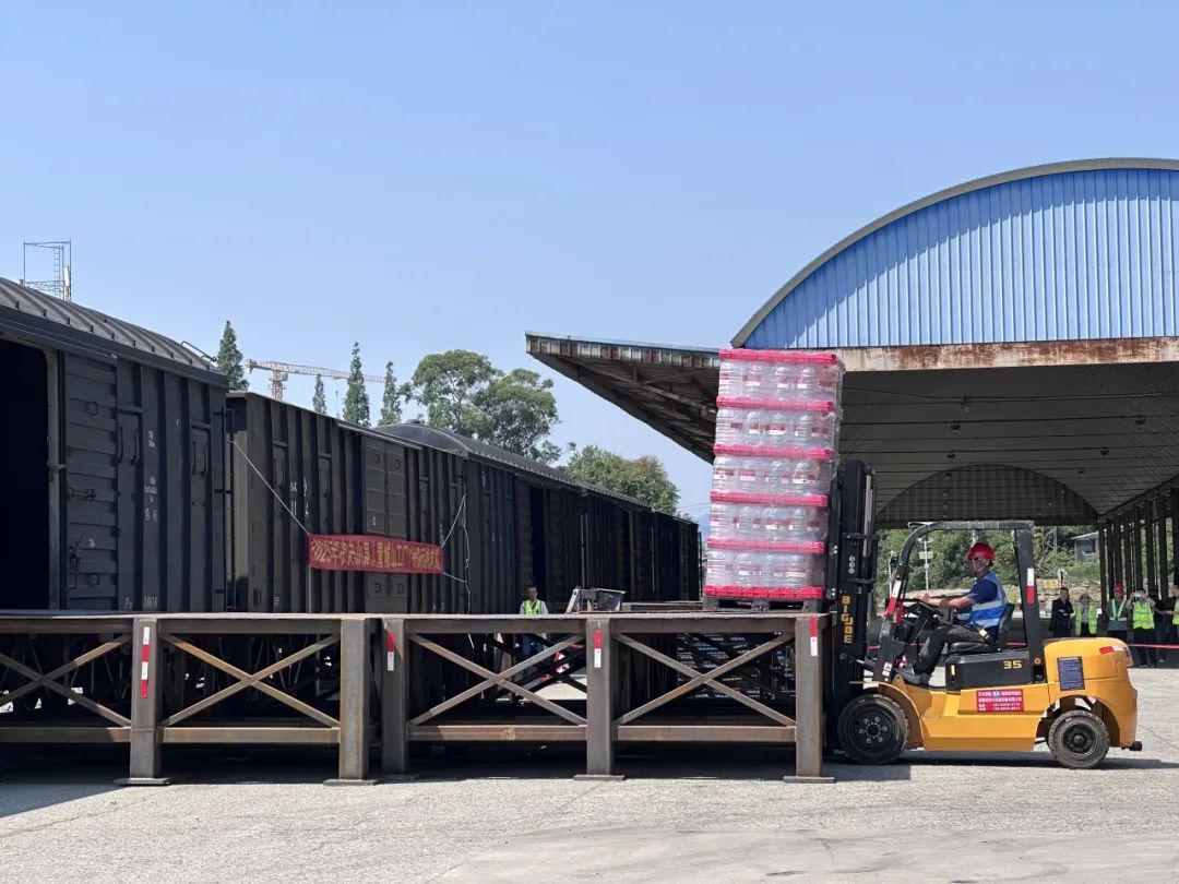 在项目筹备期间,为精准匹配农夫山泉青城山工厂产品特性及物流需求,该中心量身定制物流方案,优化铁路干线运输与公路短驳的衔接时效,充分释放铁路运输成本优势。面对蒲阳站场地限制,成都铁路物流中心联合绵阳车务段积极应对,下好“车务+物流”融合发展一盘棋,共同攻克场地条件难题,通过搭建专用装卸平台、优化作业流程、制定托盘卡控加固方案,确保装卸安全与运输顺畅,为项目成功落地奠定基础。