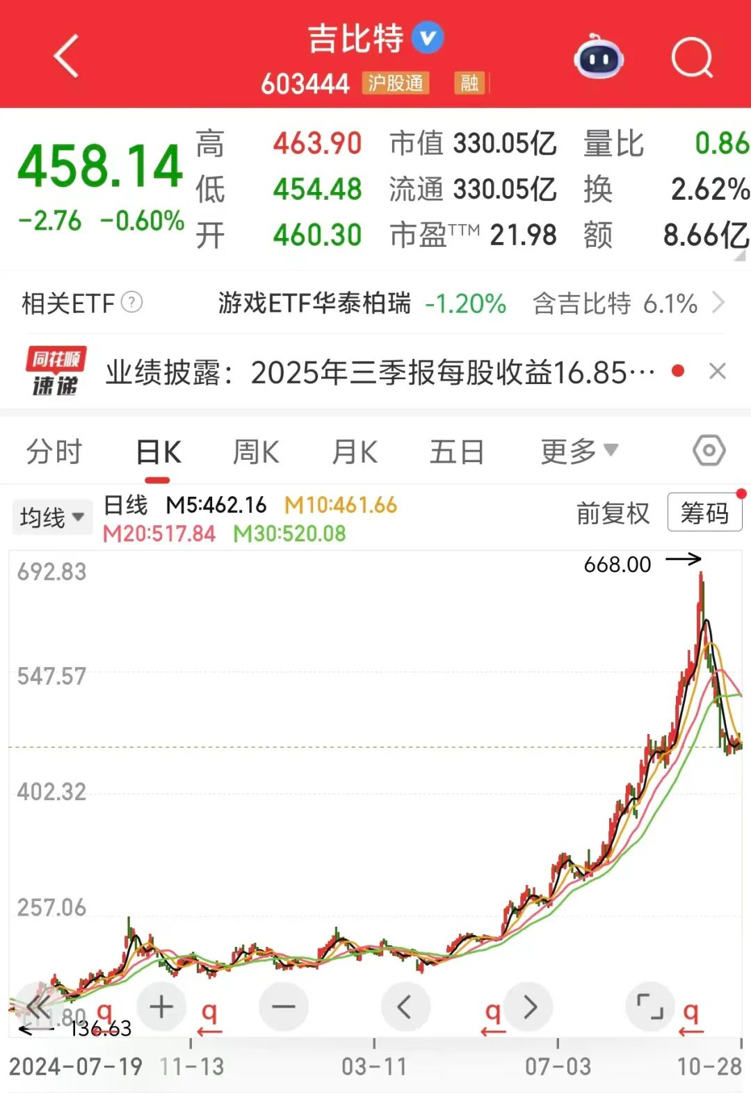 同花顺(300033)数据显示,10月28日,吉比特收报458.14元/股,最新市值为330.05亿元。今年以来,吉比特股价累计涨超119%。