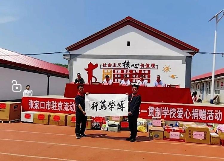 捐赠仪式上张家口驻北京怀柔区流动党委书记,中国名家书画艺术研究院常务副院长张和向学校捐赠亲自题写的书法作品《博学笃行》,希望在校学生认真努力学习,践行到社会做有用之人,将来也能够通过能力回报家乡。